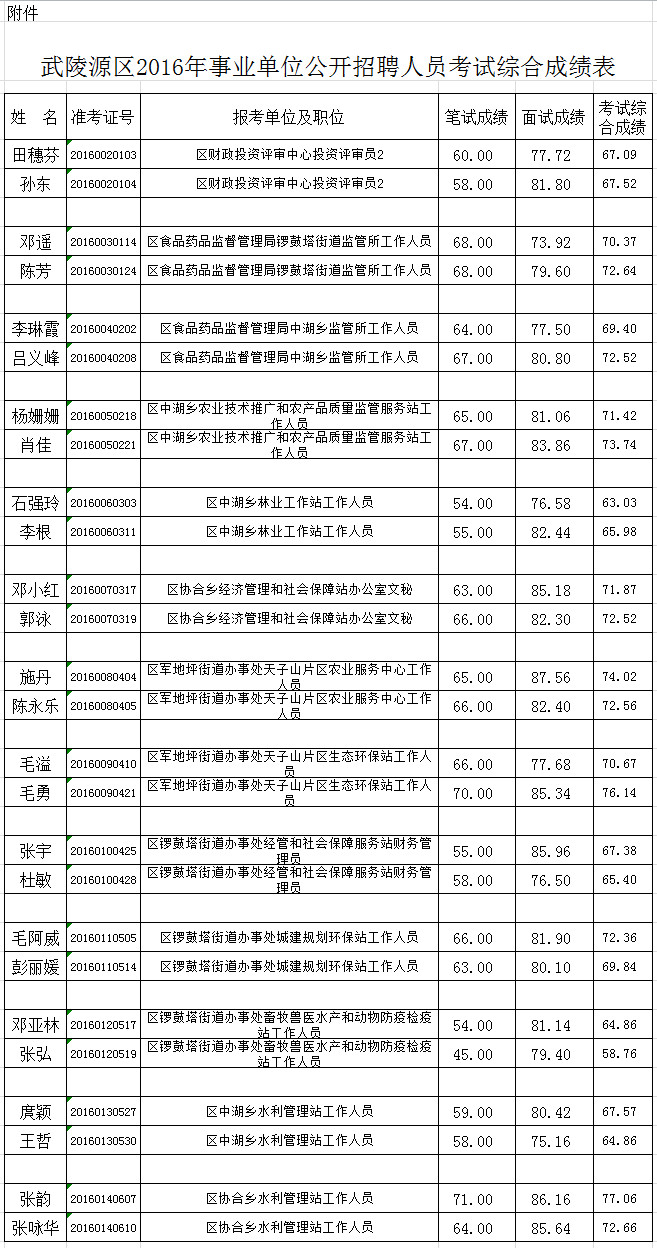 武陵源區(qū)2016年事業(yè)單位公開(kāi)招聘人員考試綜合成績(jī)公布