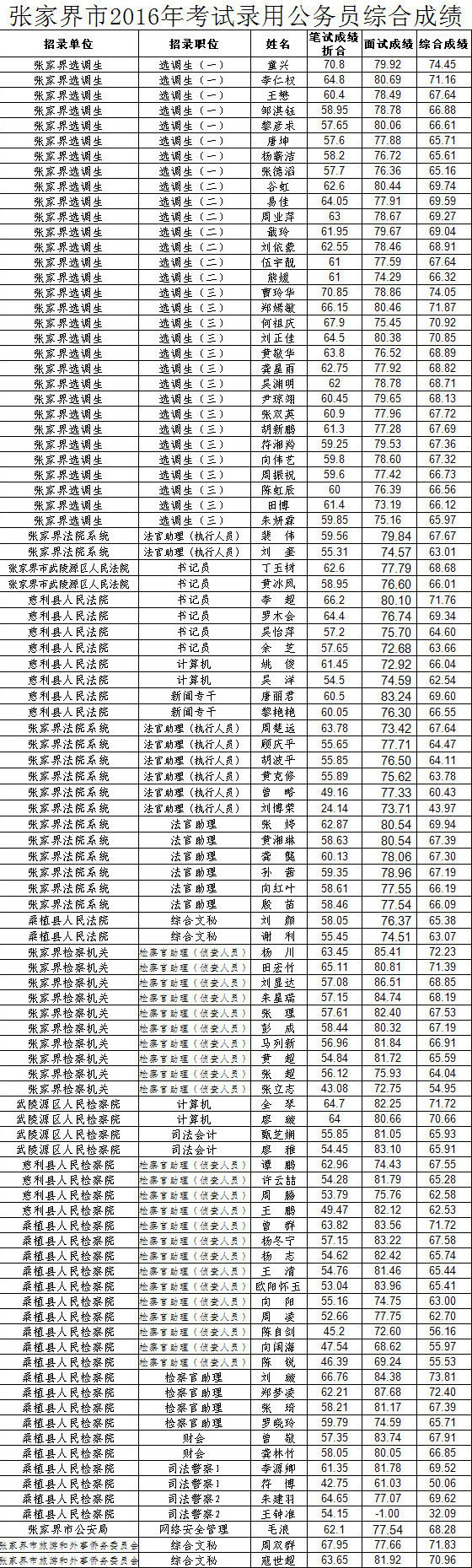 2016年湖南省考試錄用公務員張家界市考點面試工作已經結束,現將考生面試成績和綜合成績予以公布。如有異議,請與張家界市人力資源和社會保障局聯系。