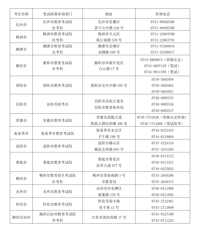 3.湖南省中小學(xué)教師資格考試筆試各考區(qū)(市州教育考試機(jī)構(gòu))聯(lián)系地址和電話(huà)如下表: