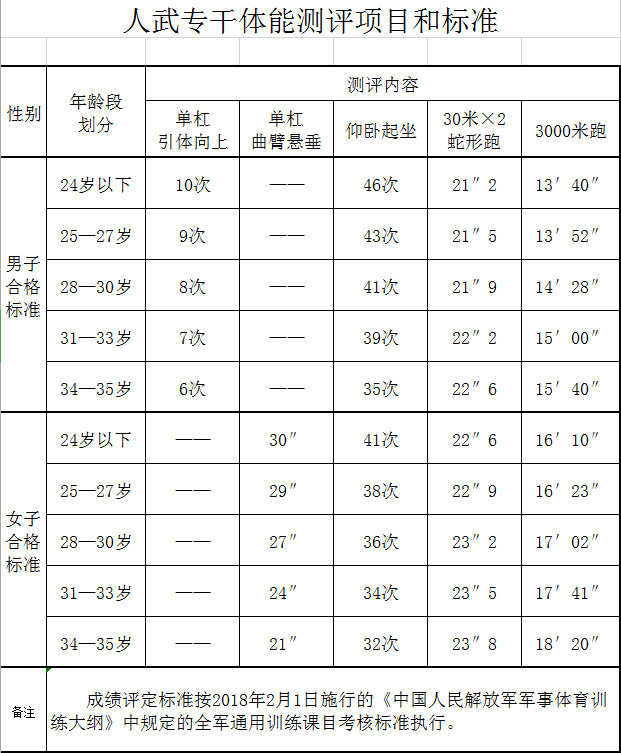 人武專干體能測(cè)評(píng)項(xiàng)目和標(biāo)準(zhǔn)