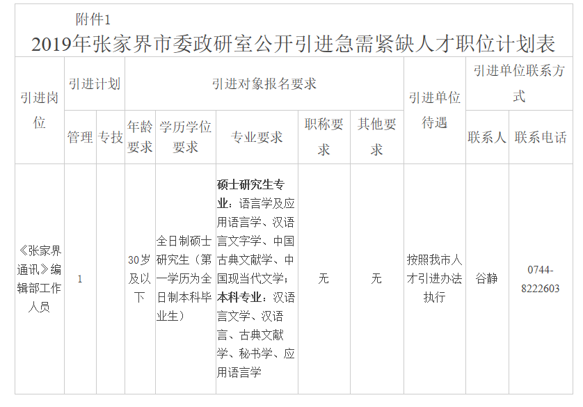 1. 2019年張家界市委政研室公開引進急需緊缺人才職位計劃表