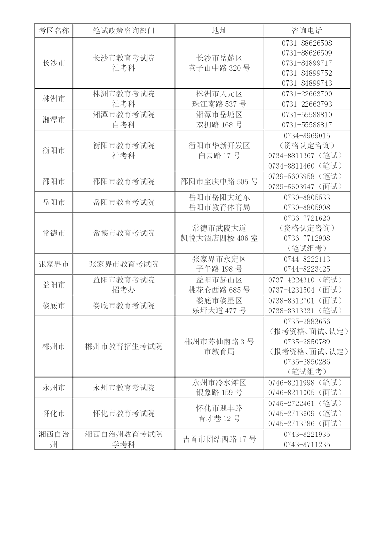 (六)湖南省中小學(xué)教師資格考試(筆試)各考區(qū)(市州教育考試院)聯(lián)系地址和電話如下表: