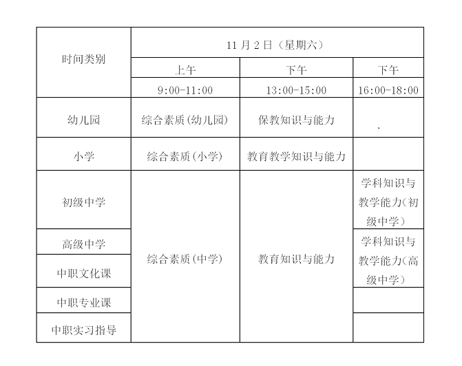 (四)全國統(tǒng)一考試時間為11月2日,各類別考試科目與時間安排如下: