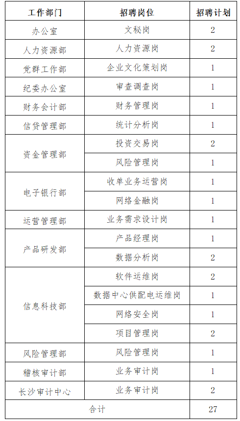 面向社會公開招聘省農(nóng)信聯(lián)社機關(含長沙審計中心)工作人員27人。招聘崗位及招聘計劃數(shù)見下表: